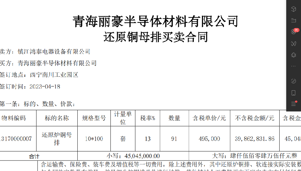 4月18日上午,我公司與青海麗豪半導體材料有限公司簽訂多晶硅還原銅母排合作協(xié)議,簽約雙方希望在技術(shù)研···